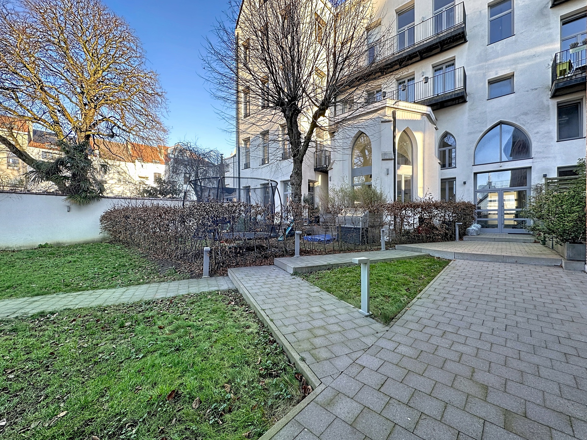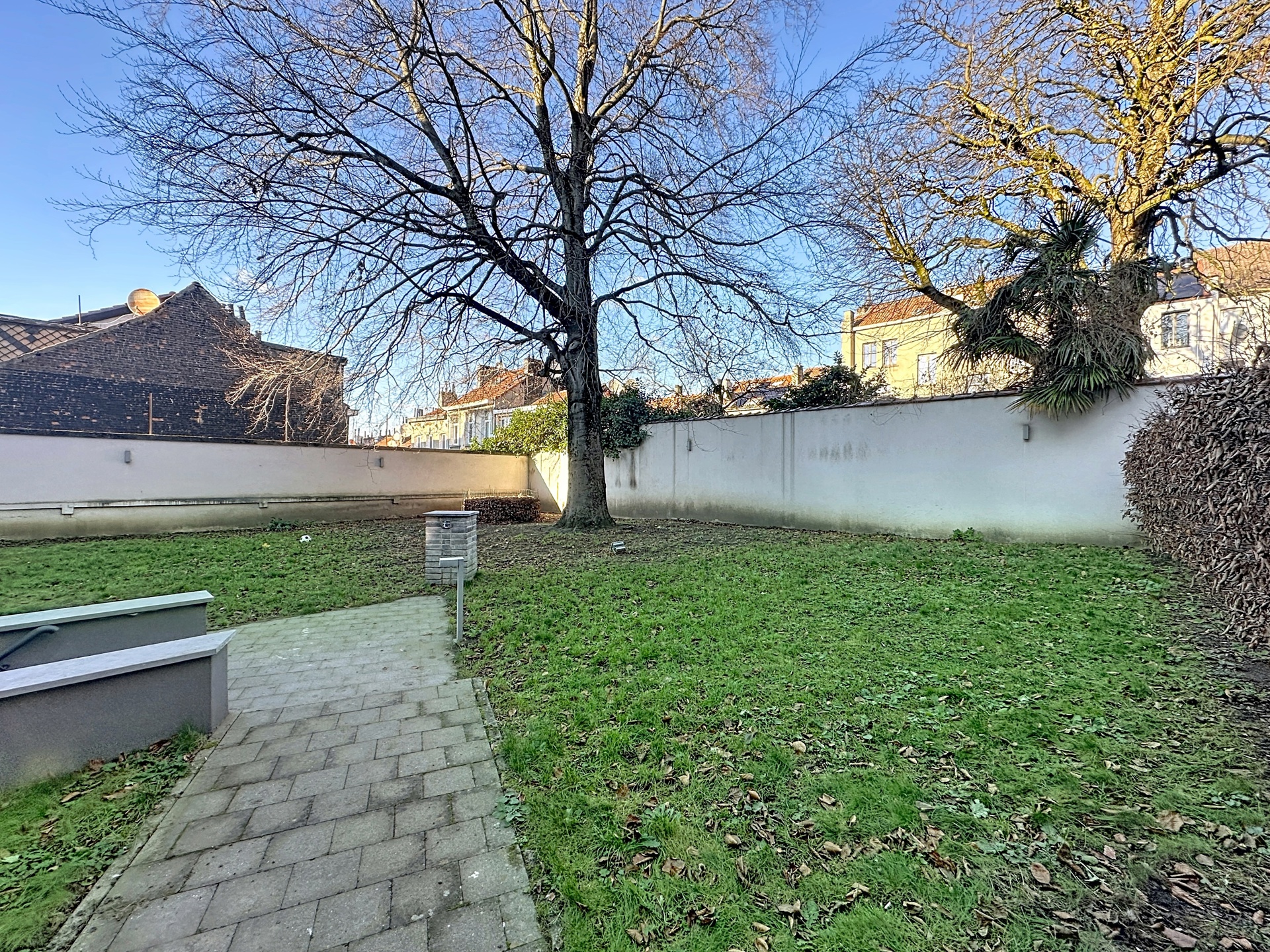 The building features a shared green garden, a secure bike storage, compliant electrical installation, and low monthly charges.