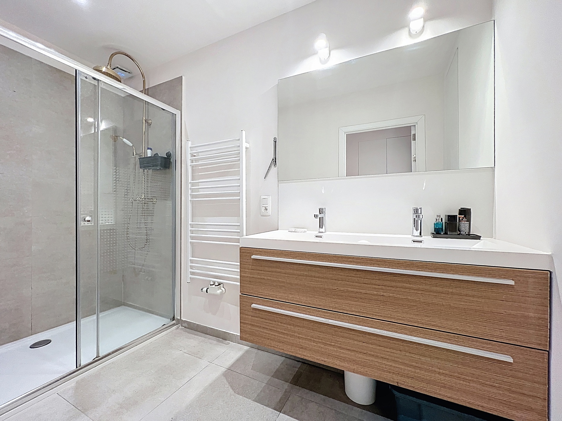 Het appartement overtuigt door zijn royale volumes en uitstekende lichtinval. Het omvat een ruime leefruimte, een volledig uitgeruste open keuken met eetruimte en directe toegang tot de zonnige tuin, twee mooie slaapkamers, een badkamer en een discrete wasruimte.